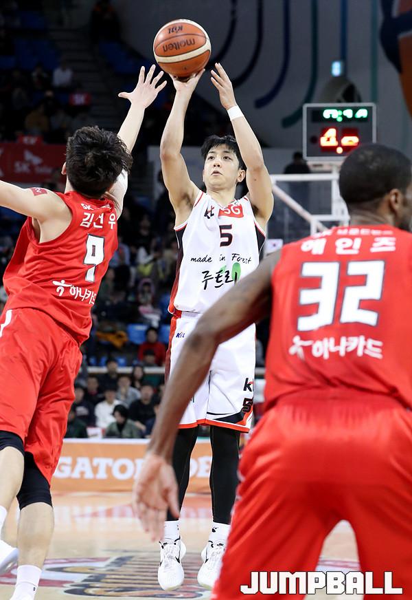 [점프볼=잠실/백승철 기자] 17일 잠실학생체육관에서 2018-2019 SKT 5GX 프로농구 서울 SK와 부산 KT의 경기가 열렸다. KT 허훈이 슛을 시도하고 있다.
