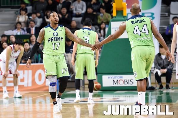 [점프볼=원주/윤희곤 기자] 17일 원주 종합체육관에서 열린 ‘2018-2019 SKT 5GX 프로농구’ 원주 DB와 고양 오리온의 경기. DB 포스터와 윌리엄스가 하이파이브를 나누고 있다.