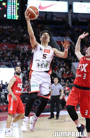[점프볼=원주/윤희곤 기자] 17일 원주 종합체육관에서 열린 ‘2018-2019 SKT 5GX 프로농구’ 원주 DB와 고양 오리온의 경기. 오리온 박상호가 DB 김태홍의 수비를 피해 레이업 슛을 시도하고 있다.