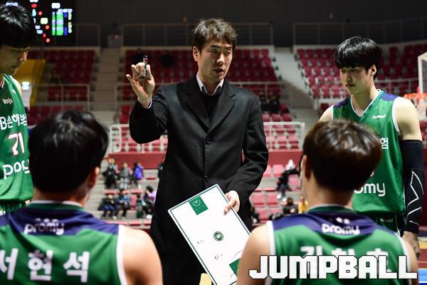[점프볼=수원/박상혁 기자] 18일 경희대학교 국제캠퍼스 선승관에서 '2018-2019 KBL D-리그 2차 대회' 원주 DB와 전주 KCC의 경기가 열렸다. DB 김성철 코치가 선수들에게 작전을 지시하고 있다.