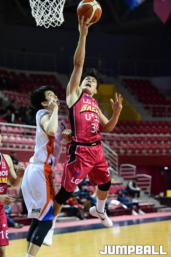 [점프볼=수원/박상혁 기자] 18일 경희대학교 국제캠퍼스 선승관에서 '2018-2019 KBL D-리그 2차 대회' 창원 LG와 인천 전자랜드의 경기가 열렸다. LG 정해원이 어려운 자세에서 레이업 슛을 올리고 있다.