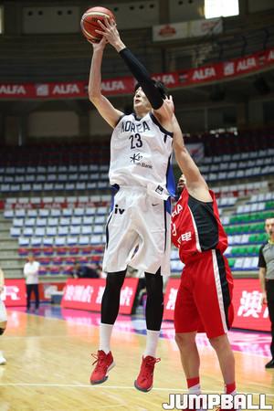 22일(이하 한국시간) 레바논 스타드 노하우드 나우팔 체육관에서 열린 2019 국제농구연맹(FIBA) 농구월드컵 아시아예선 경기, 한국남자농구대표팀의 장신 포워드 최진수가 자신감 있는 모습으로 중거리 점퍼를 던지고 있다.