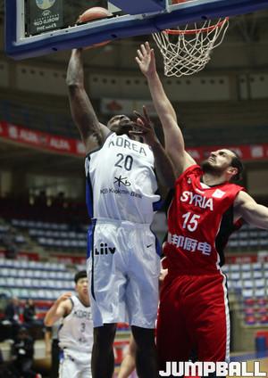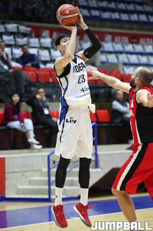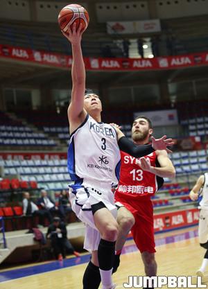 22일(이하 한국시간) 레바논 스타드 노하우드 나우팔 체육관에서 열린 2019 국제농구연맹(FIBA) 농구월드컵 아시아예선 경기, 한국남자농구대표팀의 김종규가 상대를 완전히 농락하는 페이크 동작에 이어 레이업슛으로 마무리를 하고 있다.