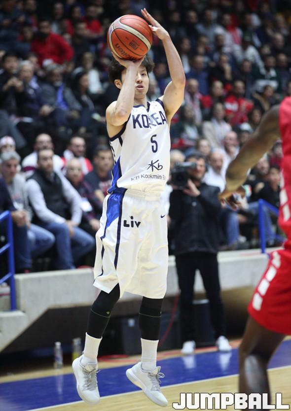 24일(한국시간) 레바논 스타드 노하우드 나우팔 체육관에서 2019 국제농구연맹(FIBA) 중국농구월드컵 아시아-오세아니아 예선 레바논과의 마지막 예선 경기. 한국 대표팀의 김시래가 교체 투입된 직후 외곽에서 슛을 날리고 있다.