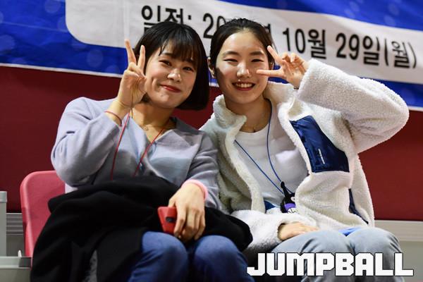 [점프볼=수원/박상혁 기자] 26일 경희대학교 국제캠퍼스 선승관에서 '2018-2019 KBL D-리그 2차 대회' 전주 KCC와 인천 전자랜드의 준결승전이 열렸다. 여자프로농구 KEB 하나은행 서수빈과 김지영이 관중석에서 경기를 관전하고 있다.