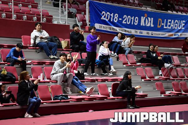 [점프볼=수원/박상혁 기자] 26일 경희대학교 국제캠퍼스 선승관에서 '2018-2019 KBL D-리그 2차 대회' 전주 KCC와 인천 전자랜드의 준결승전이 열렸다. 전자랜드의 공격이 계속해서 성공되자 관중석에서 환호하고 있다.