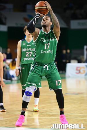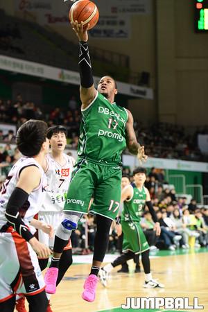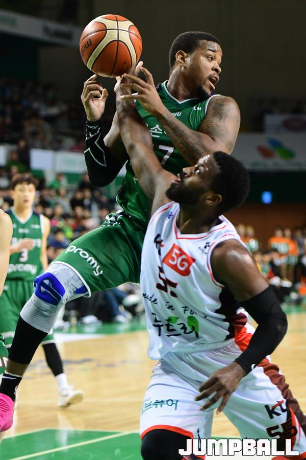 [점프볼=원주/박상혁 기자] 28일 원주종합체육관에서 2018-2019 SKT 5GX 원주 DB와 부산 KT의 경기가 열렸다. KT 덴트몬이 DB 포스터가 리바운들 잡고 내려오는 순간을 캐치해 스틸로 연결시키고 있다.