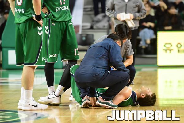 [점프볼=원주/박상혁 기자] 28일 원주종합체육관에서 2018-2019 SKT 5GX 원주 DB와 부산 KT의 경기가 열렸다. DB 허웅이 경기 도중 허리 부상으로 코트 바닥에 쓰러져 있다.