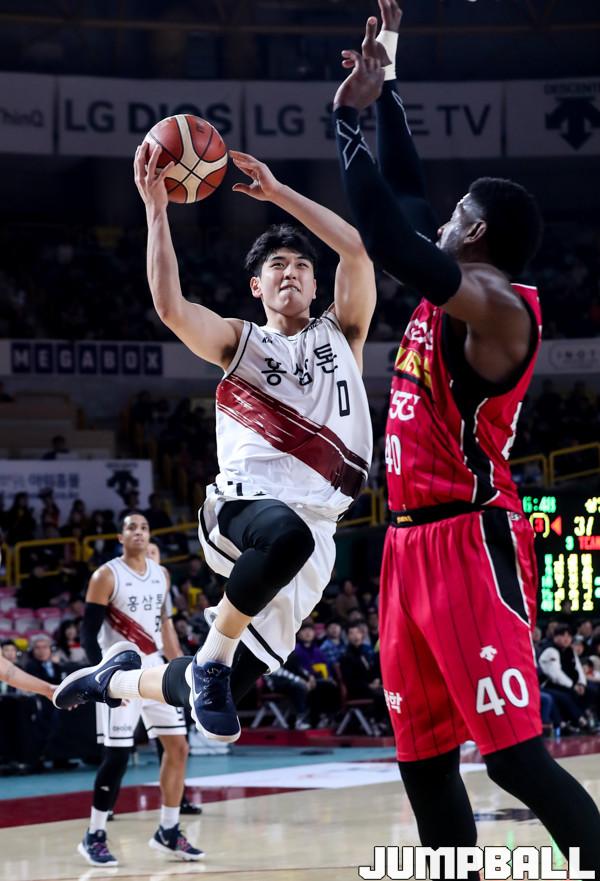 2일 창원 실내체육관에서 열린 '2018-2019 SKT 5GX 프로농구' 창원 LG와 안양 KGC의 경기에서 KGC 변준형이 LG 메이스의 수비를 피해 슛을 하고 있다.