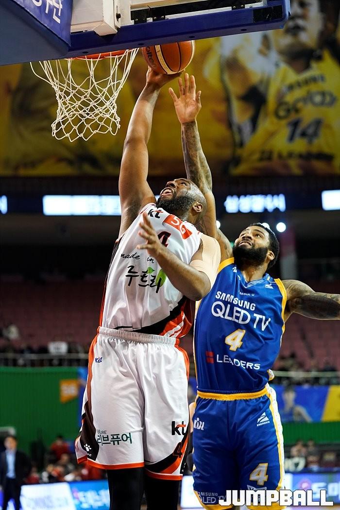 [점프볼=잠실/유용우 기자] 2일 잠실실내체육관에서 열린 '2018-2019 SKT 5GX 프로농구' 서울 삼성과 부산 kt의 경기, kt 랜드리가 삼성 펠프스의 수비를 두고 공격을 시도하고 있다.