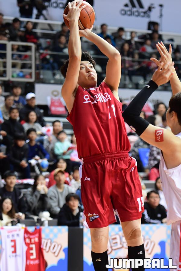[점프볼=고양/박상혁 기자] 3일 고양체육관에서 2018-2019 SKT 5GX 프로농구 정규리그 고양 오리온과 서울 SK의 경기가 열렸다. 오리온 허일영이 수비를 앞에두고 슛을 던지고 있다.