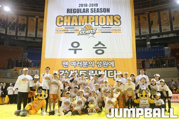 3일 청주실내체육관에서 열린 우리은행 2018-2019 여자프로농구 정규리그 경기, 청주 KB스타즈가 부천 KEB하나은행을 71-65로 꺾고 13년만에 졍규리그 우승을 달성한 뒤 KB스타즈 선수들과 코칭스태프, 구단 관계자들이 모두 모여 기념촬영을 하고 있다.