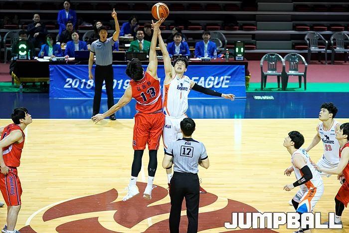 [점프볼=수원/유용우 기자] 4일 경희대학교 국제캠퍼스 선승관에서 열린 '2018-2019 KBL D-리그 2차 대회' 현대모비스와 전자랜드의 결승, 양팀 선수들의 점프볼로 경기가 시작되었다.