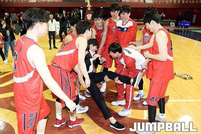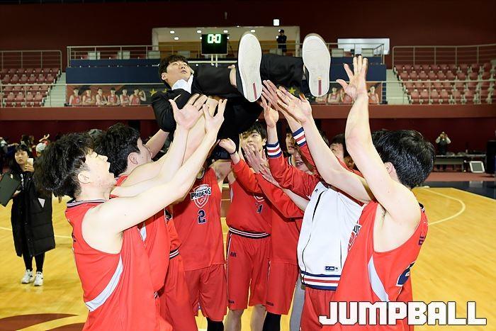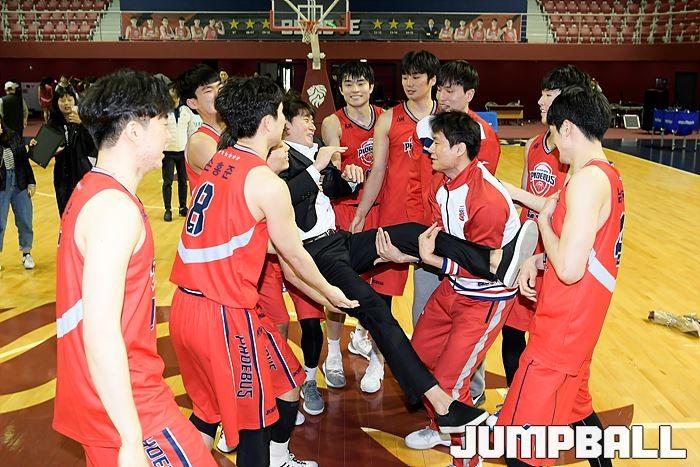 [점프볼=수원/유용우 기자] 4일 경희대학교 국제캠퍼스 선승관에서 열린 '2018-2019 KBL D-리그 2차 대회' 현대모비스와 전자랜드의 결승, 현대모비스가 89-72로 전자랜드에 승리하며 D리그 2차대회 우승을 차지하였다. 현대모비스 박구영 코치가 선수들에게 행가레를 받고 있다.