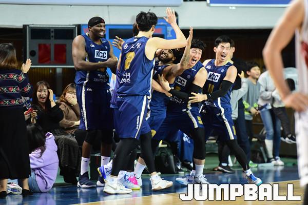 [점프볼=전주/박상혁 기자] 7일 전주실내체육관에서 2018-2019 SKT 5GX 프로농구 정규리그 전주 KCC와 안양 KGC인삼공사의 경기가 열렸다. KCC 선수들이 킨의 버져비터가 성공되자 다같이 기뻐하고 있다. KCC가 KGC인삼공사에 막판 킨의 버져비터로 82대 81로 승리하였다.