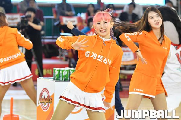 [점프볼=잠실학생체/홍기웅 기자] 8일 잠실학생체육관에서 열린 '2018-2019 SKT 5GX 프로농구' 서울 SK와 창원 LG의 경기. SK 치어리더가 환한 웃음과 함께 게토레이 응원 동작에 맞춰 응원을 유도하고 있다.
