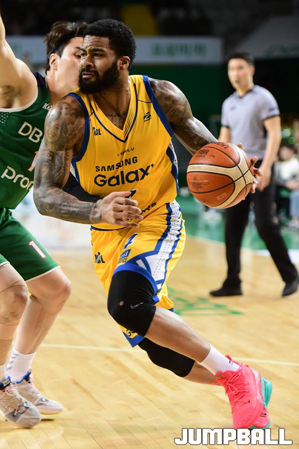 [점프볼=원주/박상혁 기자] 8일 원주종합체육관에서 2018-2019 SKT 5GX 프로농구 정규리그 원주 DB와 서울 삼성의 경기가 열렸다. 삼성 펠프스가 인사이드로 들어가고 있다.