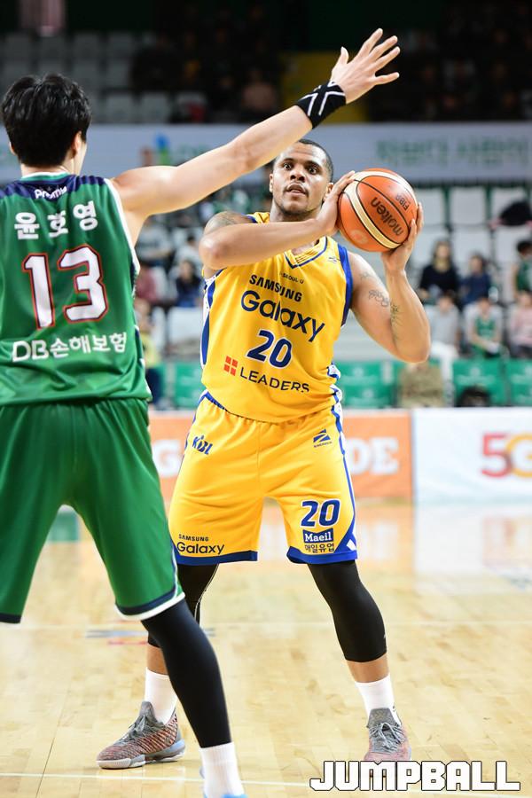 [점프볼=원주/박상혁 기자] 8일 원주종합체육관에서 2018-2019 SKT 5GX 프로농구 정규리그 원주 DB와 서울 삼성의 경기가 열렸다. 삼성 밀러가 인사이드로 패스를 시도하려고 하고있다.