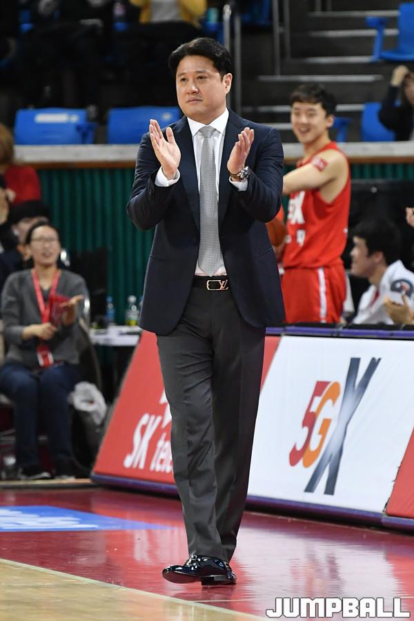 [점프볼=잠실학생체/홍기웅 기자] 10일 잠실학생체육관에서 열린 '2018-2019 SKT 5GX 프로농구' 서울 SK와 원주 DB의 경기. SK 문경은 감독이 선수들의 플레이에 박수를 치고 있다.