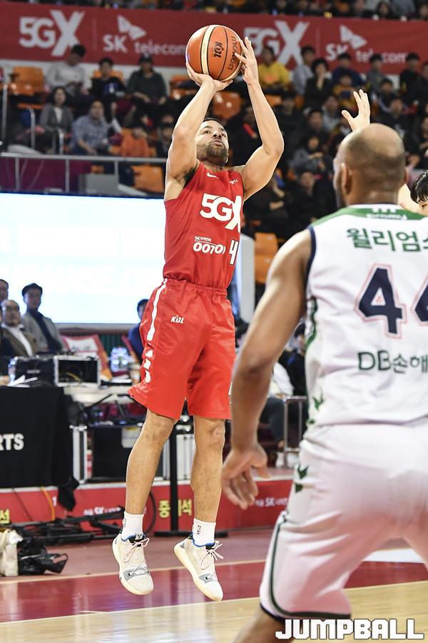 [점프볼=잠실학생체/홍기웅 기자] 10일 잠실학생체육관에서 열린 '2018-2019 SKT 5GX 프로농구' 서울 SK와 원주 DB의 경기. SK 크리스토퍼 로프튼이 3점슛을 던져 득점에 성공시키고 있다.