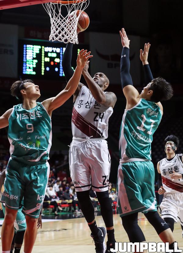 10일 사직실내체육관에서 열린 '2018-2019 SKT 5GX 프로농구' 부산 kt와 안양 KGC의 경기에서 KGC 테리가 KT 양홍석의 수비를 피해 슛을 하고 있다