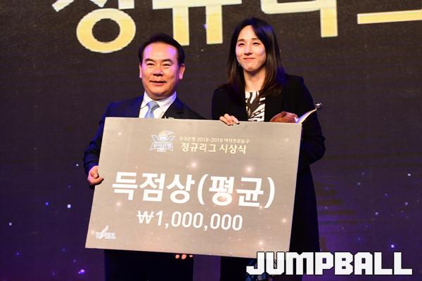 [점프볼=여의도/박상혁 기자] 11일 여의도 63빌딩 컨벤션센터에서 우리은행 2018-2019 여자프로농구 정규리그 시상식이 열렸다. 신한은행 김단비가 정규리그 득점상을 수상하고 있다.