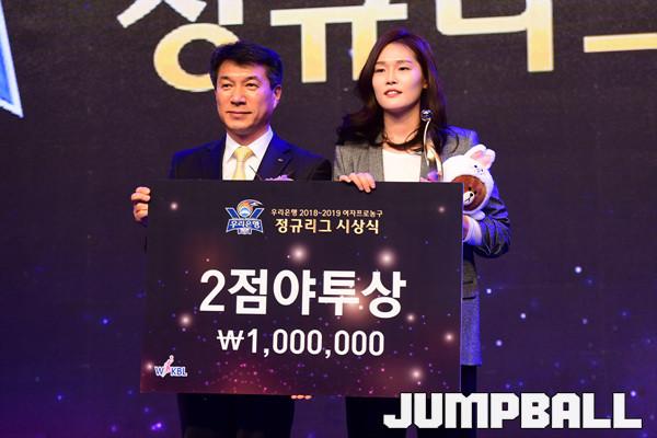 [점프볼=여의도/박상혁 기자] 11일 여의도 63빌딩 컨벤션센터에서 우리은행 2018-2019 여자프로농구 정규리그 시상식이 열렸다. 우리은행 최은실이 2점 야투상을 받고 있다.
