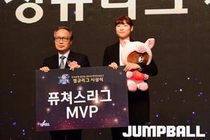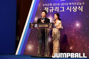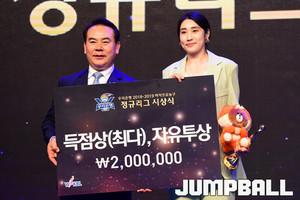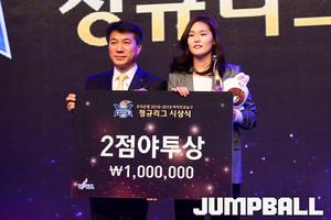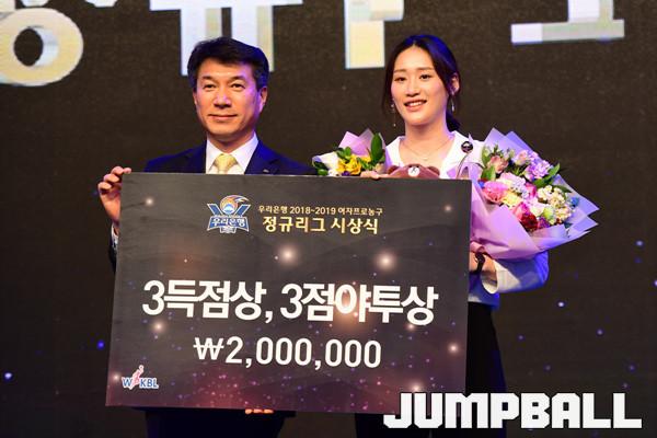 [점프볼=여의도/박상혁 기자] 11일 여의도 63빌딩 컨벤션센터에서 우리은행 2018-2019 여자프로농구 정규리그 시상식이 열렸다. KEB하나은행 강이슬이 3득점상,3점 야투상을 받고 있다.