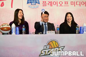 [점프볼=여의도/박상혁 기자] 11일 여의도 63빌딩 컨벤션센터에서 우리은행 2018-2019 여자프로농구 플레이오프 미디어데이가 열렸다. 우리은행 임영희가 질문에 대한 대답을 하고 있다.