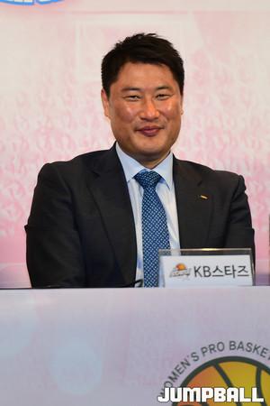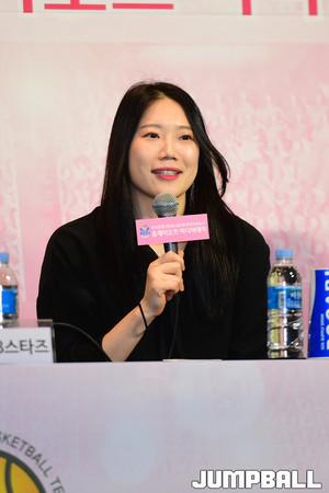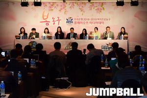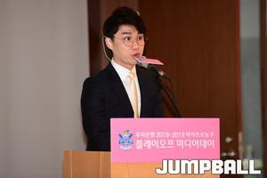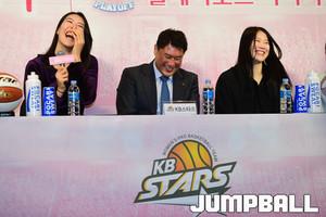 [점프볼=여의도/박상혁 기자] 11일 여의도 63빌딩 컨벤션센터에서 우리은행 2018-2019 여자프로농구 플레이오프 미디어데이가 열렸다. 여자농구 플레이오프 미디어에 참석한 감독과 선수들이 기념 촬영을 하고 있다.