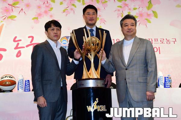 [점프볼=여의도/박상혁 기자] 11일 여의도 63빌딩 컨벤션센터에서 우리은행 2018-2019 여자프로농구 플레이오프 미디어데이가 열렸다. 챔피언을 향해 출사표를 던진 KB스타즈 안덕수 감독, 우리은행 위성우 감독, 삼성생명 임근배 감독이 우승 트로피앞에서 기념 촬영을 하고 있다.