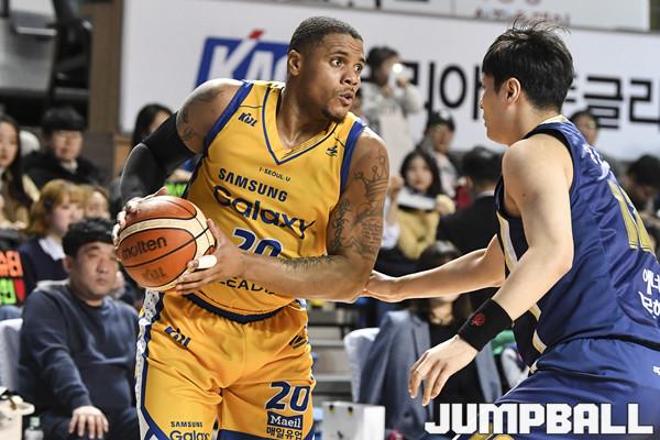 [점프볼=전주/홍기웅 기자] 13일 전주실내체육관에서 열린 '2018-2019 SKT 5GX 프로농구' 전주 KCC와 서울 삼성의 경기. 삼성 네이트 밀러가 KCC 송창용과 매치업을 펼치고 있다.