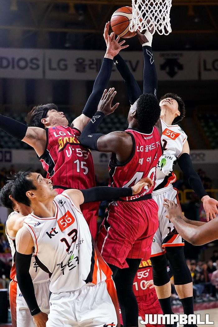 [점프볼=창원/유용우 기자] 13일 창원실내체육관에서 열린 '2018-2019 SKT 5GX 프로농구' 창원 LG와 부산 kt의 경기.LG 메이스와김종규가 리바운드를 경합하고 있다.