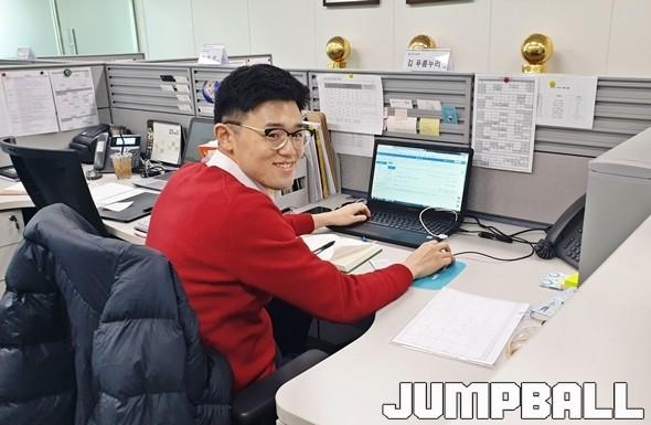 김 사원은 “예전부터 농구를 워낙 좋아했었어요. 전공은 정치외교에 역사학을 복수전공했지만, 워낙 다양한 분야의 경험들을 하려 했었어요. 대학원 준비도 했었고, 음악 쪽도 관심이 있어 작곡을 하면서 밴드도 했었죠. 그러다 스포츠에 관련된 일을 하고 싶다는 생각이 들어서 캐스터를 준비했었어요. 근데 카메라 테스트에서 떨어진 거죠. 불합격을 했는데도 스포츠 관련 직종에 종사하고 싶어서 온갖 홈페이지를 돌아다녔었는데 마침 인턴사원 공고를 보게 된 거에요. 사무국도 정말 매력있어 보였거든요. 사실 합격에 대한 기대는 없었는데, 운이 정말 좋았죠”라며 지나간 시간을 회상했다.