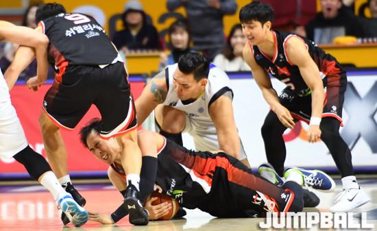 [점프볼=부산/문복주 기자] 15일 부산사직실내체육관에서 열린 '2018-2019 SKT 5GX 프로농구' 부산 KT와 전주 KCC의 경기, KT 김현민이 종료직전에 몸을 날려 루즈볼을 잡아내고 있다.