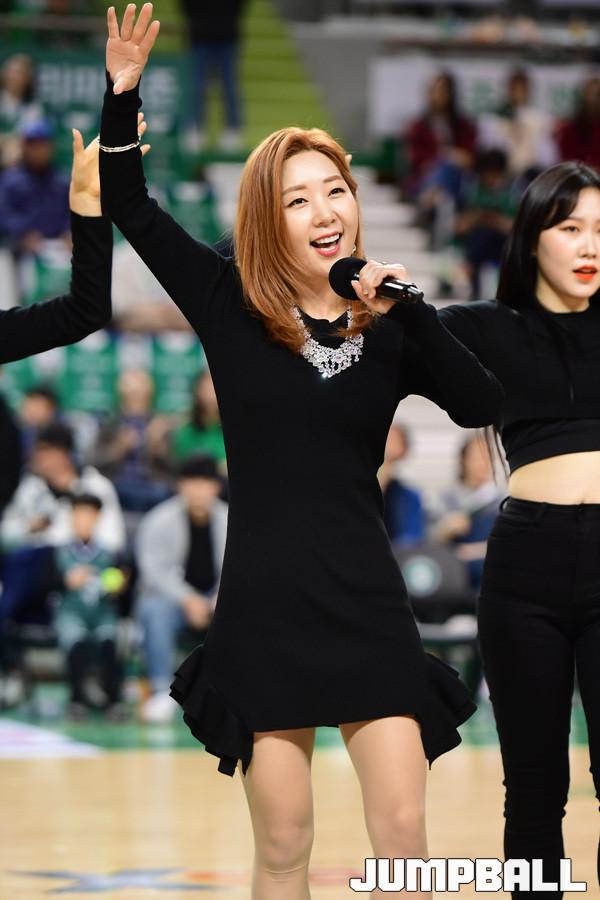 [점프볼=원주/박상혁 기자] 16일 원주종합체육관에서 2018-2019 SKT 5GX 프로농구 정규리그 원주 DB와 울산 현대모비스의 경기가 열렸다. 하프타임에 트로트 가수 홍시가 공연을 하고 있다.