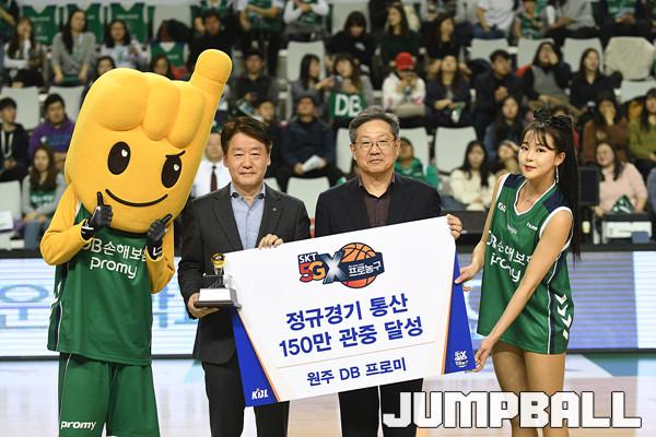 19일 원주종합체육관 에서 열린 '2018-2019 SKT 5GX 프로농구' 원주 DB 와 창원 LG 의 경기에서 하프타임 원두 DB 프로미의 정규경기 통산 150만 관중 달성 시상이 있었다.