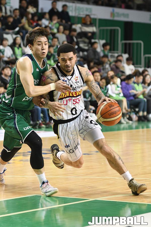 19일 원주종합체육관 에서 열린 '2018-2019 SKT 5GX 프로농구' 원주 DB 와 창원 LG 의 경기에서 조쉬 그레이가 돌파를 시도하고 있다.
