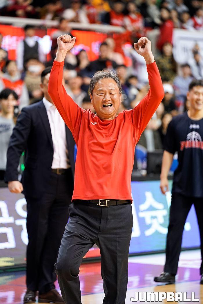 [점프볼=울산/유용우 기자] 19일 울산동천체육관에서 열린 '2018-2019 SKT 5GX 프로농구' 울산 현대모비스와 서울 삼성의 경기, 현대모비스가 76-66으로 승리하였다. 경기후 현대모비스 유재학 감독과 이대성의 자유투 대결이 선수단과 홈팬들의 관심 속에 열렸다. 현대모비스 유재학 감독이 자유투 대결에서 10-6으로 승리하며 기뻐하고 있다.