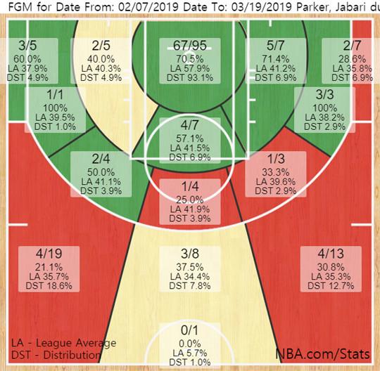 #자바리 파커 워싱턴 이적 후 17경기 야투성공률 분포도(*19일 기준)