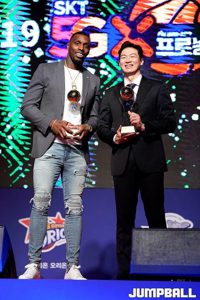 [점프볼=삼성동/유용우 기자] 20일 삼성동 그랜드 인터컨티넨탈 서울 파르나스 그랜드볼룸에서 열린 2018-19 SKT 5GX 프로농구 시상식. KCC 이정현과 현대모비스 라건아가 포토라인에서 기념촬영을 하고 있다.