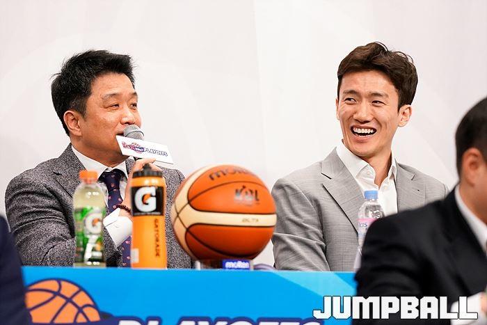 [점프볼=청담/유용우 기자] 21일 서울 청담동 리베라 호텔베르사유홀에서 열린 2018-2019 SKT 5GX 프로농구 플레이오프 미디어데이, 전자랜드 박찬희가 유도훈 감독의 대답에 환하게 웃고 있다.