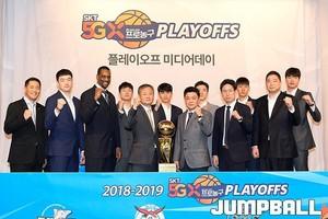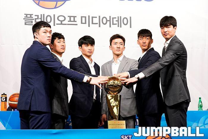 [점프볼=청담/유용우 기자] 21일 서울 청담동 리베라 호텔베르사유홀에서 열린 2018-2019 SKT 5GX 프로농구 플레이오프 미디어데이, 6팀의 선수들이 플레이오프 선전을 다짐하며 사진촬영을 하고 있다.