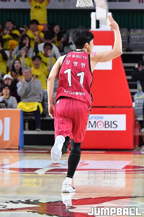 [점프볼=창원/홍기웅 기자] 24일 창원실내체육관에서 열린 '2018-2019 SKT 5GX 프로농구' 6강 플레이오프 창원 LG와 부산 KT의 1차전 경기. LG 강병현이 득점후 세레모니를 하며 백코트하고 있다.