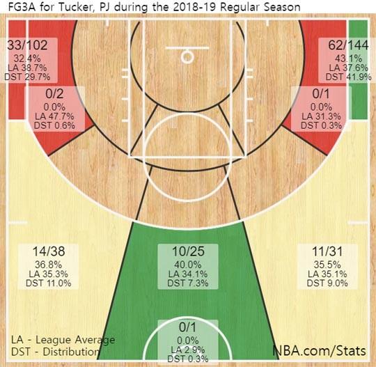 #2018-2019시즌 정규리그 P.J 터커, 3점 성공률 분포도