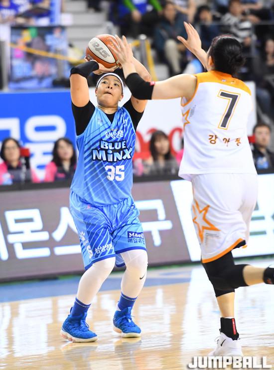[점프볼=용인/문복주 기자] 25일 용인실내체육관에서 열린 ‘우리은행 2018~2019 여자프로농구’ 챔피언결정전 3차전을 용인 삼성생명과 청주 KB스타즈의 경기. 삼성생명 김한별이 수비를 앞에두고 3점슛을 시도하고 있다.