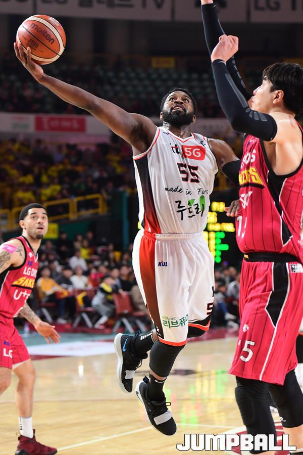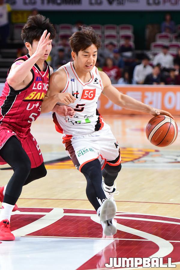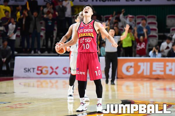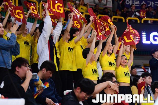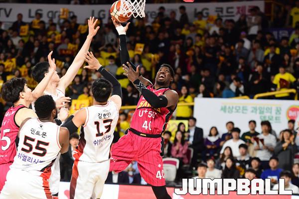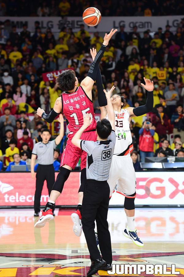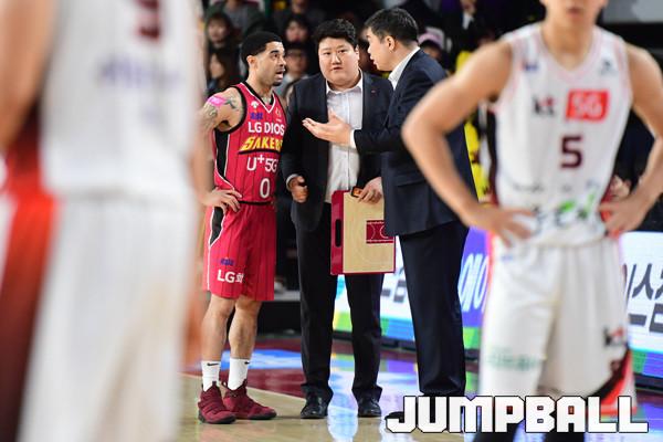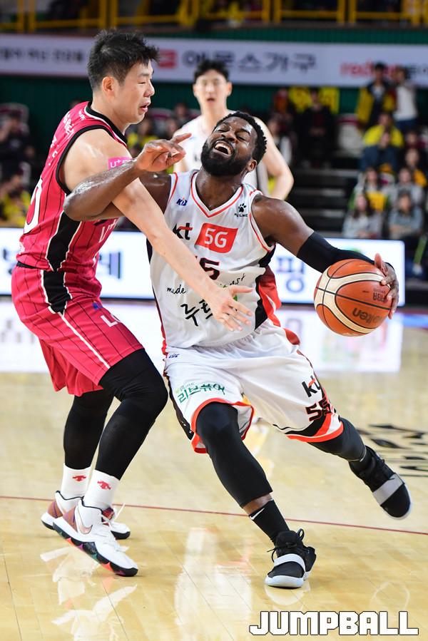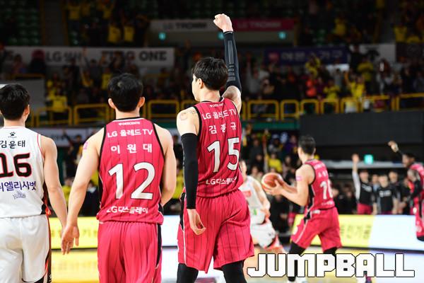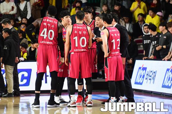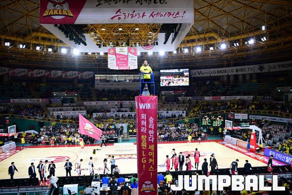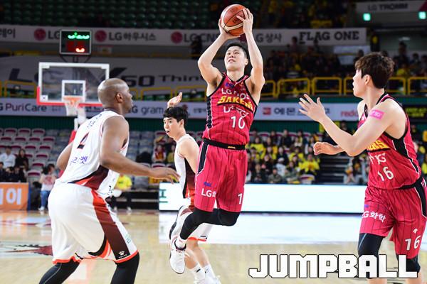 [점프볼=창원/박상혁 기자] 26일 창원실내체육관에서 2018-2019 SKT 5GX 프로농구 6강 플레이오프 창원 LG와 부산 KT의 2차전 경기가 열렸다. LG가 KT를 상대로 초반 부진을 떨쳐내고 후반 기세를 몰아 88대 84로 승리하였다. LG와 KT 경기 화보.