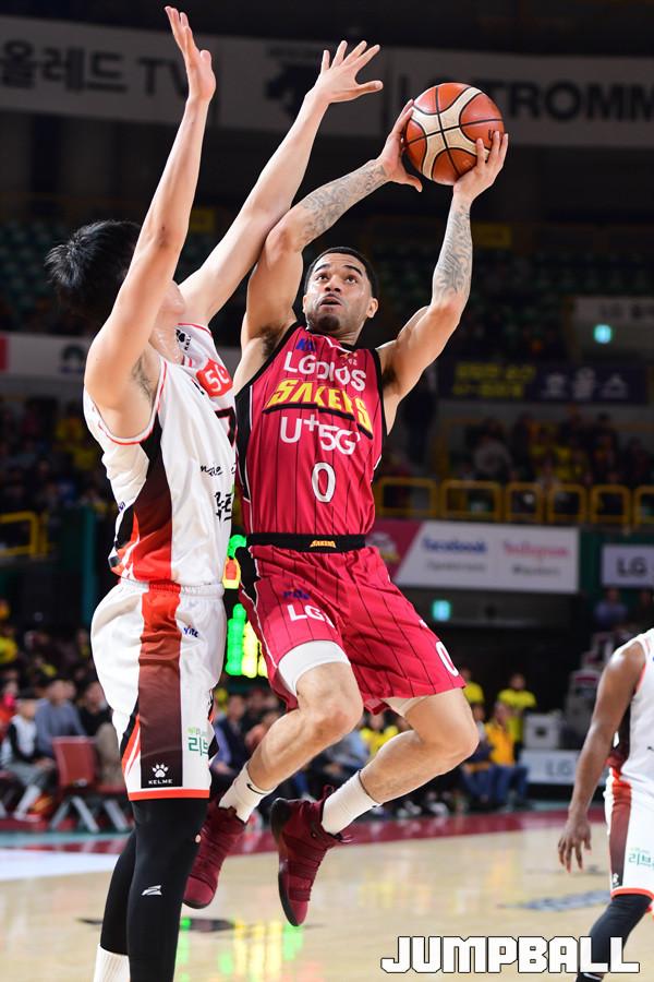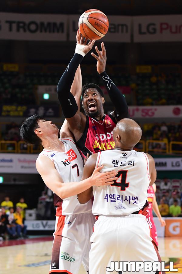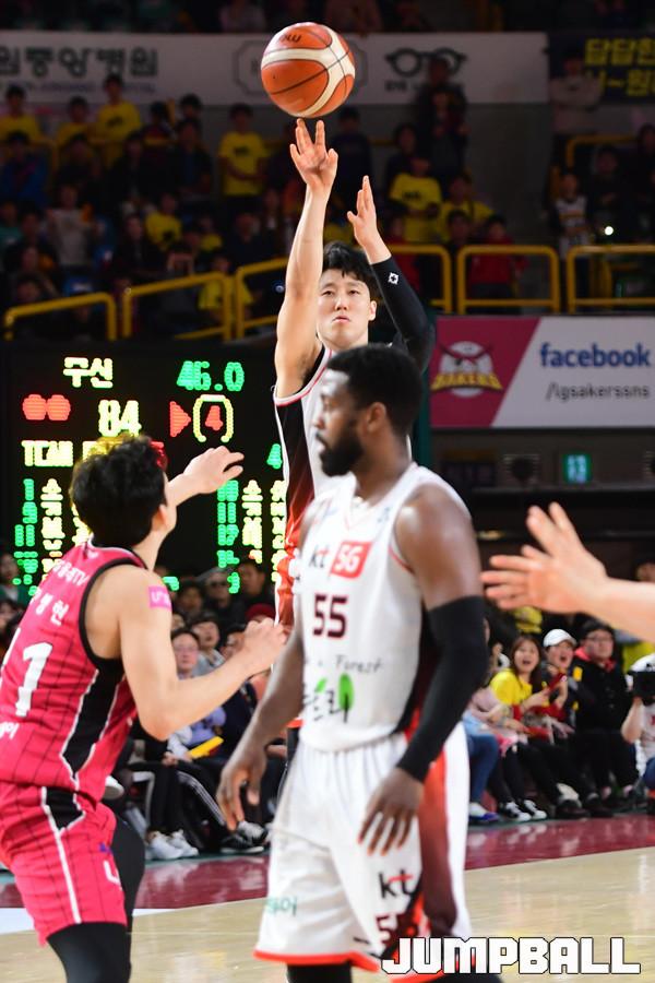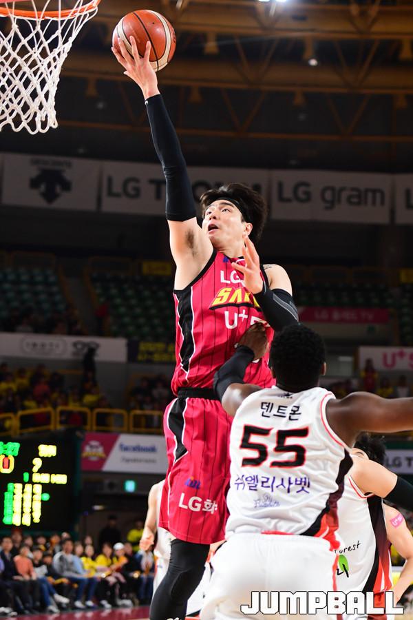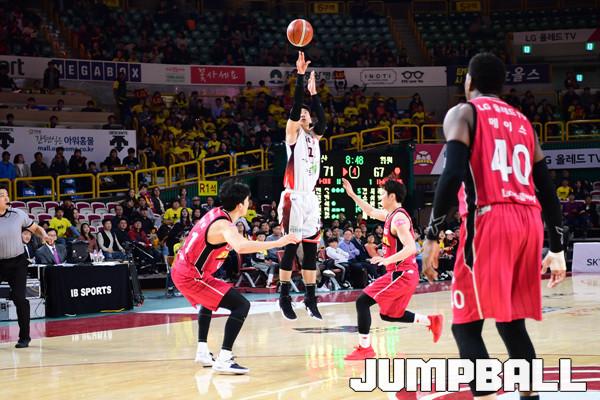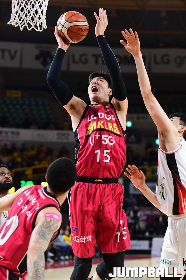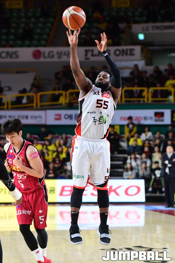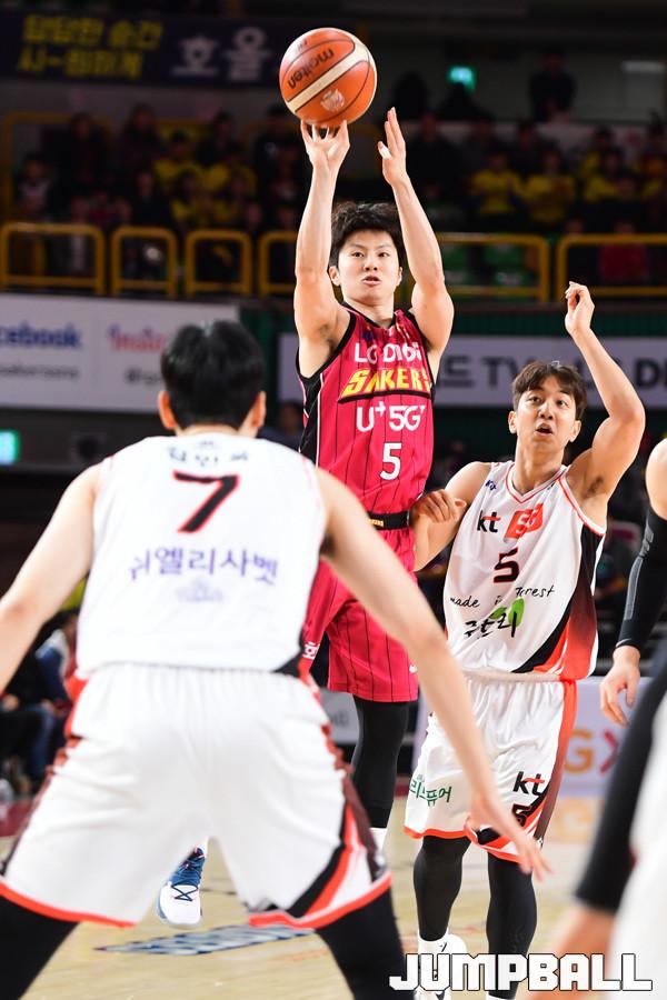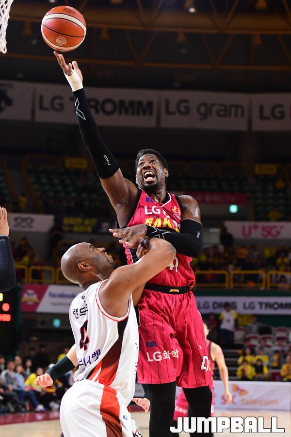 [점프볼=창원/박상혁 기자] 26일 창원실내체육관에서 2018-2019 SKT 5GX 프로농구 6강 플레이오프 창원 LG와 부산 KT의 2차전 경기가 열렸다. LG가 KT를 상대로 초반 부진을 떨쳐내고 후반 기세를 몰아 88대 84로 승리하였다. LG와 KT 경기 화보.