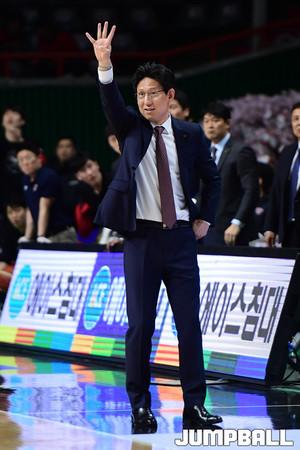 [점프볼=부산/박상혁 기자] 28일 부산사직체육관에서 2018-2019 SKT 5GX 프로농구 부산 KT와 창원 LG의 6강 플레이오프 3차전 경기가 열렸다. LG 현주엽 감독이 선수들에게 지시를 내리고 있다.