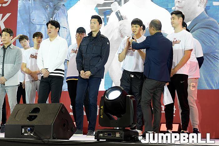 [점프볼=잠실/유용우 기자] SK 나이츠 농구단은 30일 잠실 학생체육관에서 18-19 시즌동안 SK를 응원해준 팬들을 위한 '2019 SK 나이츠 팬스 기빙데이' 팬행사를 마련했다. SK 김선형이 팬들에게 인사를 하고 있다.